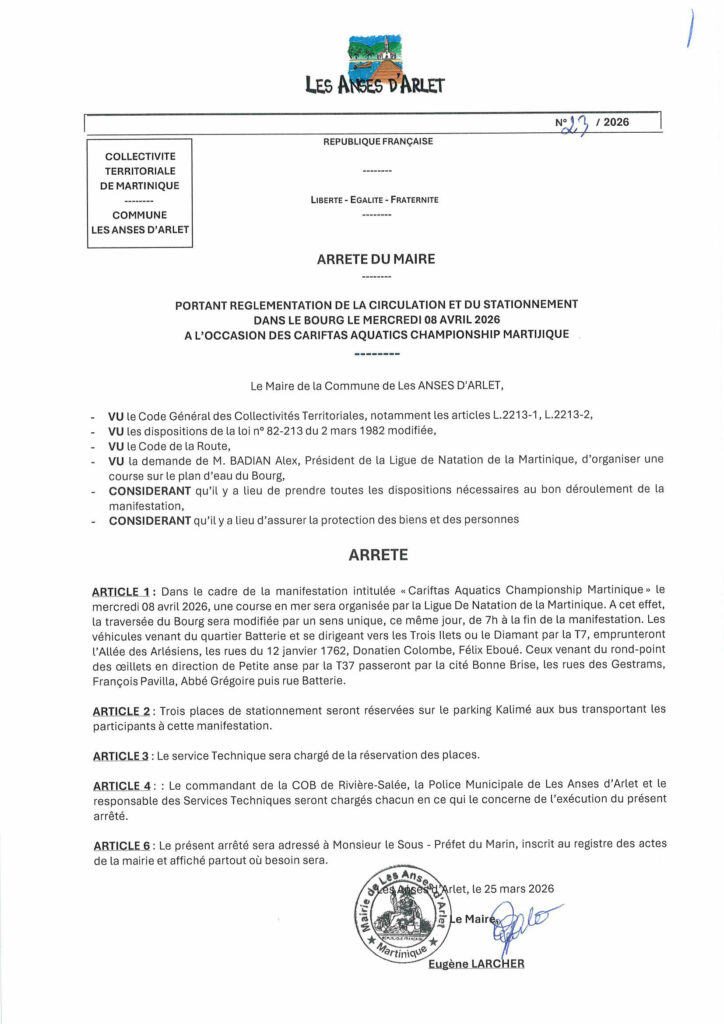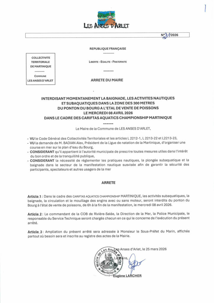 Le Président de la Communauté d’Agglomération de l’Espace Sud Martinique informe les usagers de la Zone de Mouillage Organisée des Anses d’Arlet de la tenue des épreuves de natation des Carifta Games 2026, organisée par la Ligue de Natation de Martinique, sur le plan d’eau de la Baie du Bourg.
