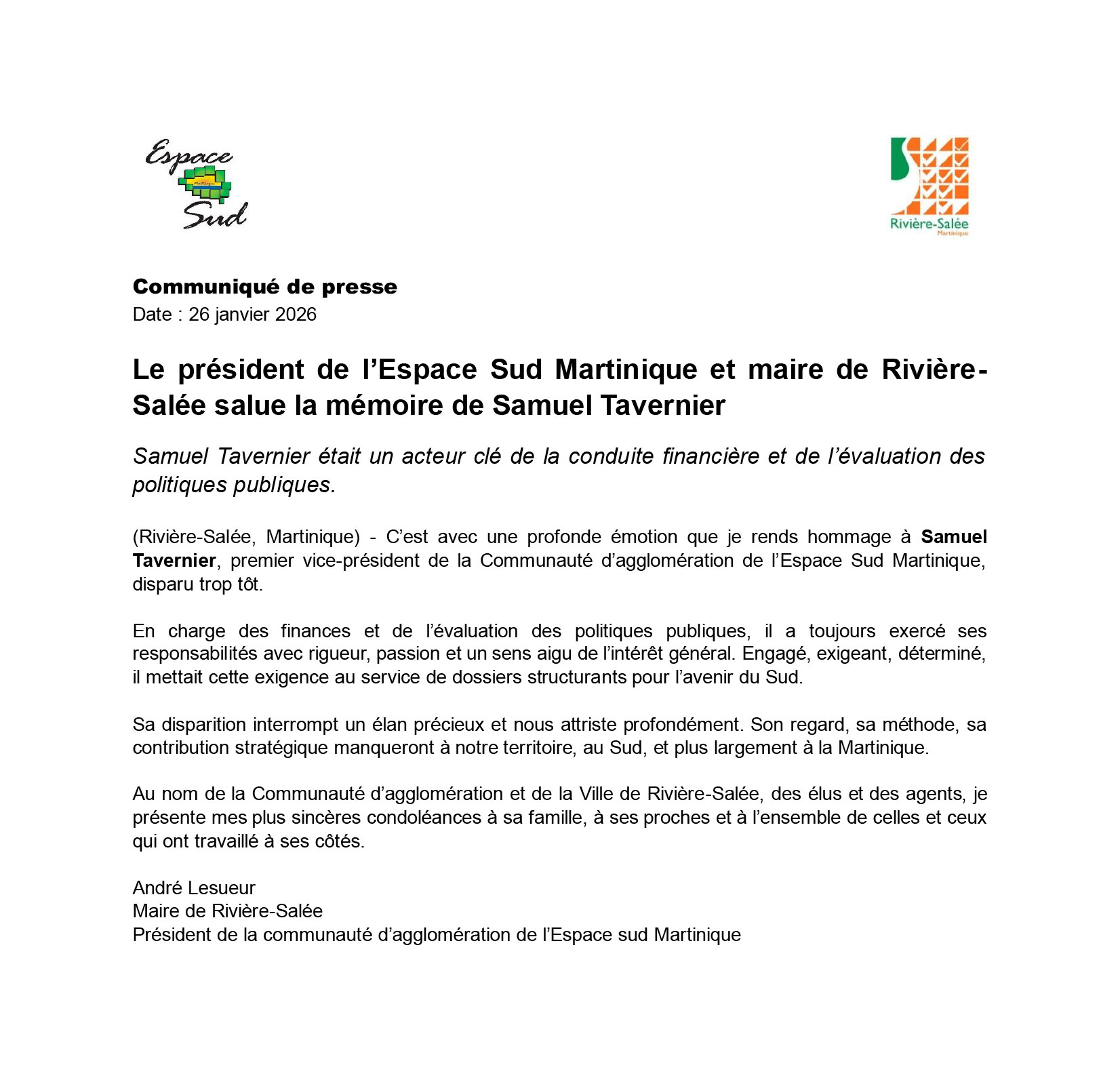 Le président de l’Espace Sud Martinique et maire de Rivière-Salée salue la mémoire de Samuel Tavernier (communiqué)