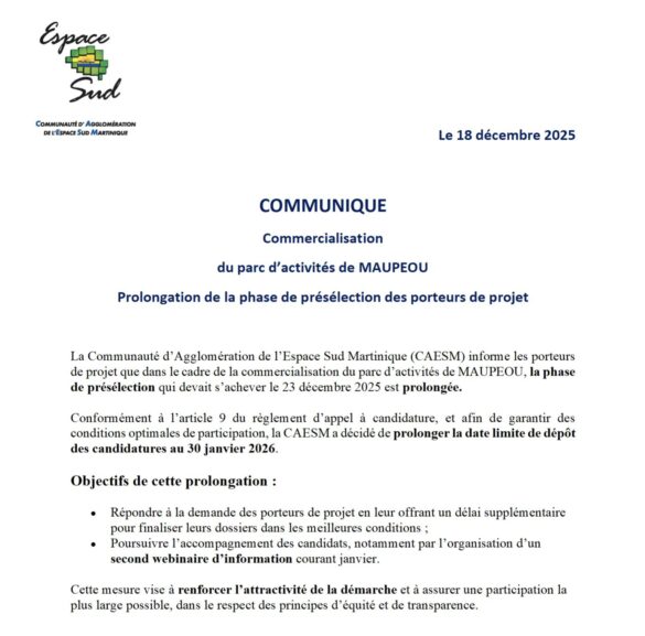 COMMUNIQUE La Communauté d’Agglomération de l’Espace Sud Martinique (CAESM) informe les porteurs de projet que dans le cadre de la commercialisation du parc d’activités de MAUPEOU, la phase de présélection qui devait s’achever le 23 décembre 2025 est prolongée. Conformément à l’article 9 du règlement...
