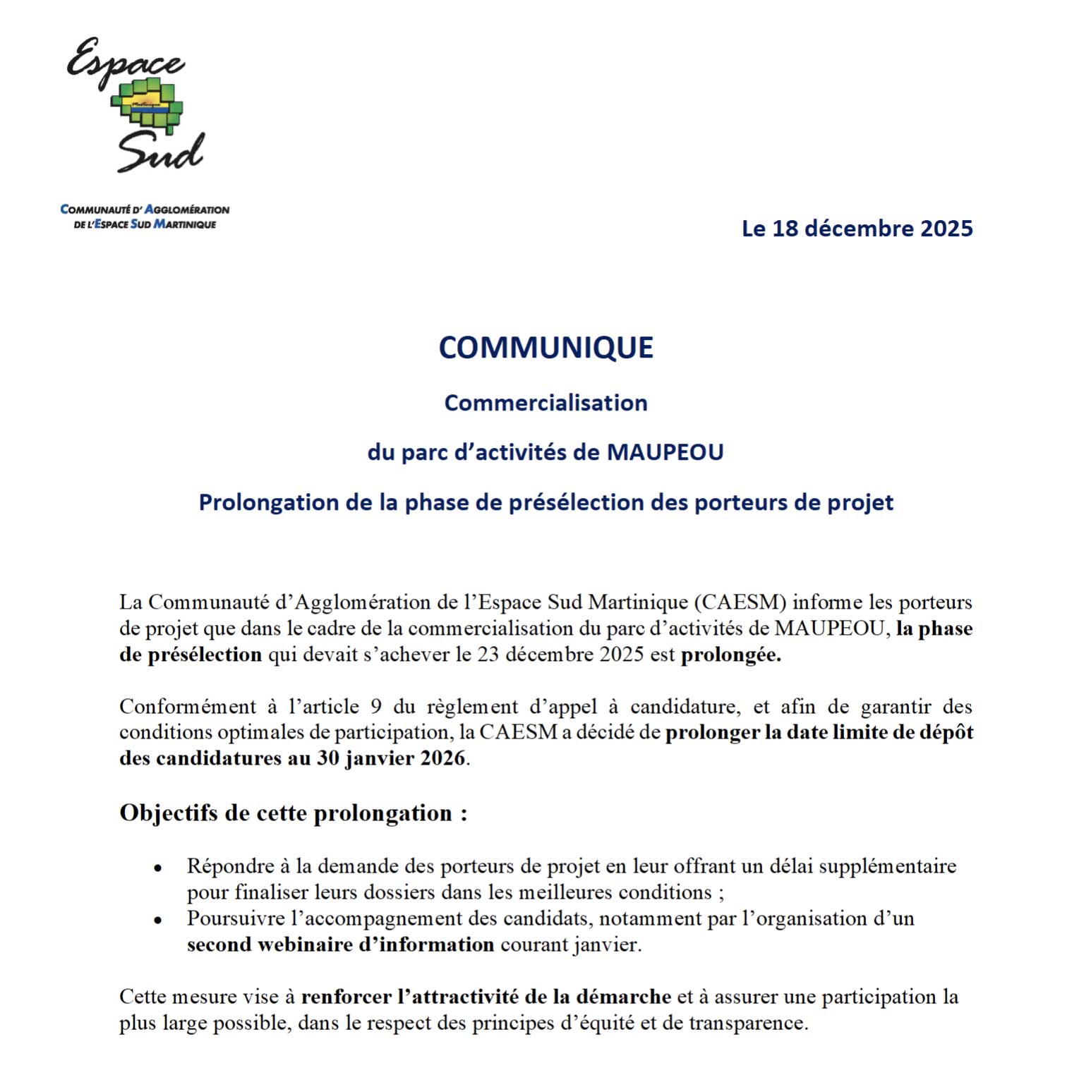La Communauté d’Agglomération de l’Espace Sud Martinique (CAESM) informe les porteurs de projet que dans le cadre de la commercialisation du parc d’activités de MAUPEOU, la phase de présélection qui devait s’achever le 23 décembre 2025 est prolongée.