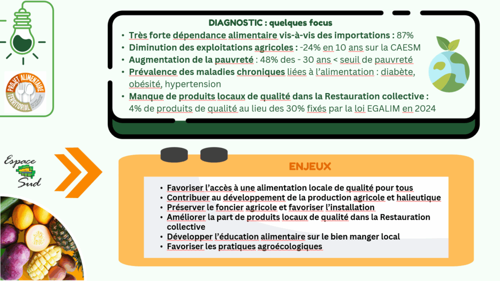 A partir du diagnostic partagé, les élus référents sur le PAT, ont fait émerger trois grands enjeux clés pour le territoire Sud de la Martinique déclinés en orientations et objectifs stratégiques puis en 20 fiches-actions réparties selon 5 thèmes clés. Ces fiches-actions sont issues d’un travail en ateliers, à l’occasion du Forum de l’alimentation locale organisé par l’Espace Sud le 13 mars 2025. Les propositions d’actions ont ensuite été retravaillées en sous-groupes afin de conserver les plus pertinentes, réalisables et impactantes.