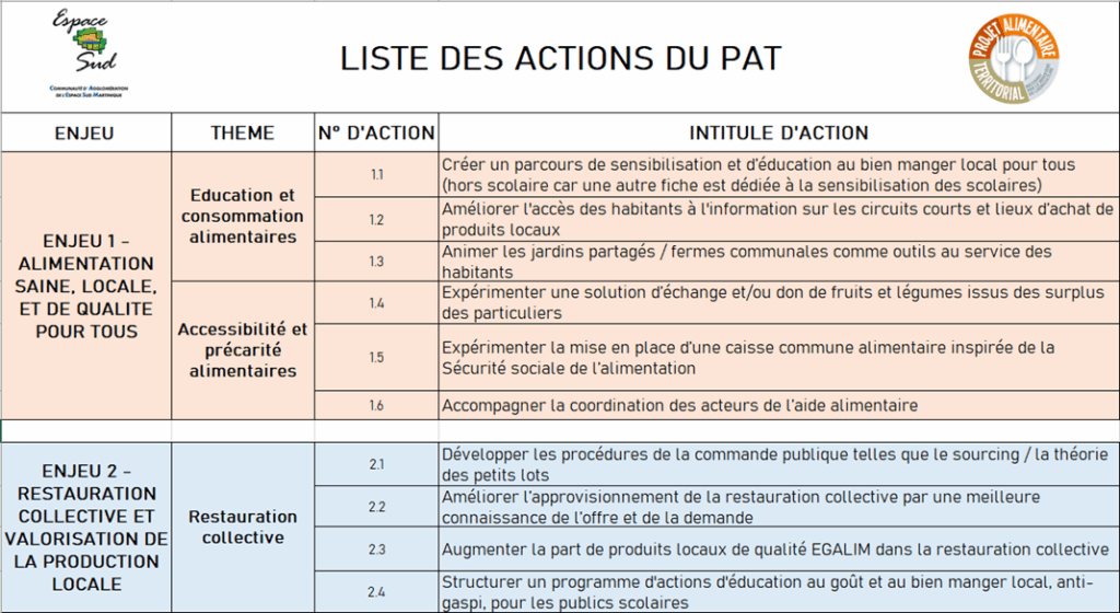 Depuis 2021, cette démarche de PAT bénéficie d’une labellisation de niveau 1 (PAT en émergence) ouvrant droit à une reconnaissance nationale et des opportunités de financement (subvention de 70 000 euros obtenue en 2021). En novembre 2025, le PAT a obtenu la labellisation de niveau 2 (PAT opérationnel). L’Espace Sud est, à ce jour, le seul territoire de Martinique à avoir cette labellisation de niveau 2.