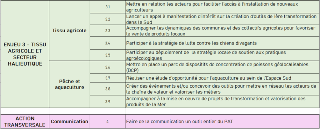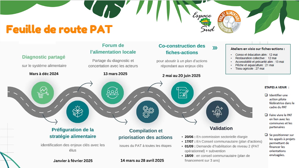 La stratégie alimentaire de l’Espace Sud et le plan d’actions y afférant ont été validés par les élus en Conseil communautaire, le 17 juillet 2025, à l’unanimité des 32 élus présents. Cela a permis le passage en phase 3 : la mise en œuvre opérationnelle du PAT.