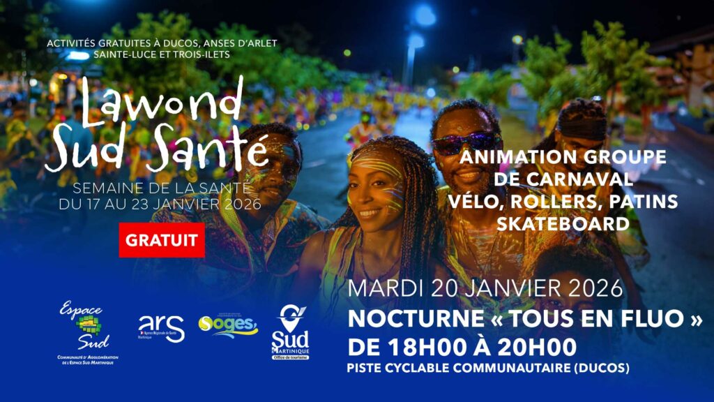 - Partenaires : l’Agence régionale de santé, la Communauté Professionnelle Territoriale de santé (CPTS) , Office du Tourisme Intercommunal (OTI), SOGES pour la Piscine communautaire, la Piste cyclable, le centre nautique, Maison sport santé du sud, Ville de Ducos, Ville de Sainte-Luce, Ville des Trois-îlets, Ville du Saint-Esprit, la Caisse Générale de Sécurité Sociale Martinique (CGSS), le Centre Ressources Éducation Prévention Santé Sexualité (CREPSS).