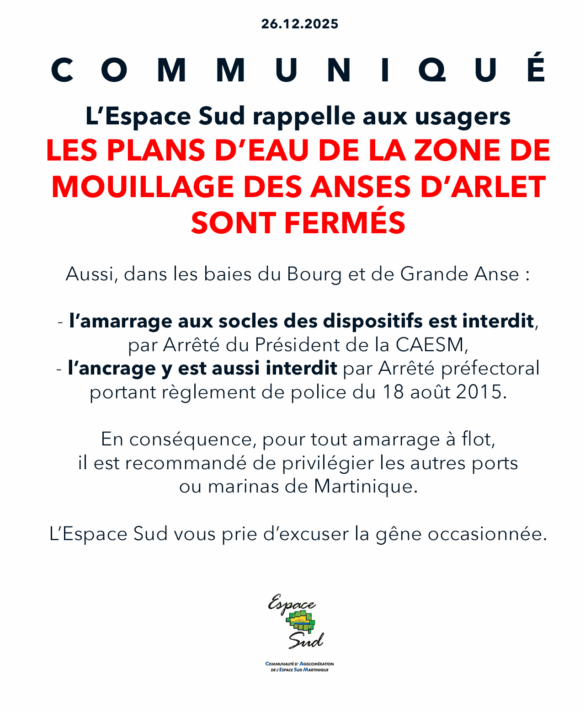 L’Espace Sud rappelle aux usagers, que les plans d’eau, de la Zone de Mouillage des Anses d’Arlet, sont fermés. Aussi,...